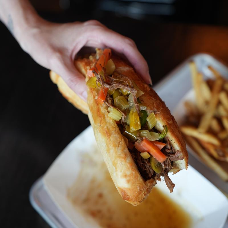 Braised beef in a savory au jus, served on a Dutch Crunch roll with roasted onions, green bell peppers, and hot giardinara for a true Chicago flavor.