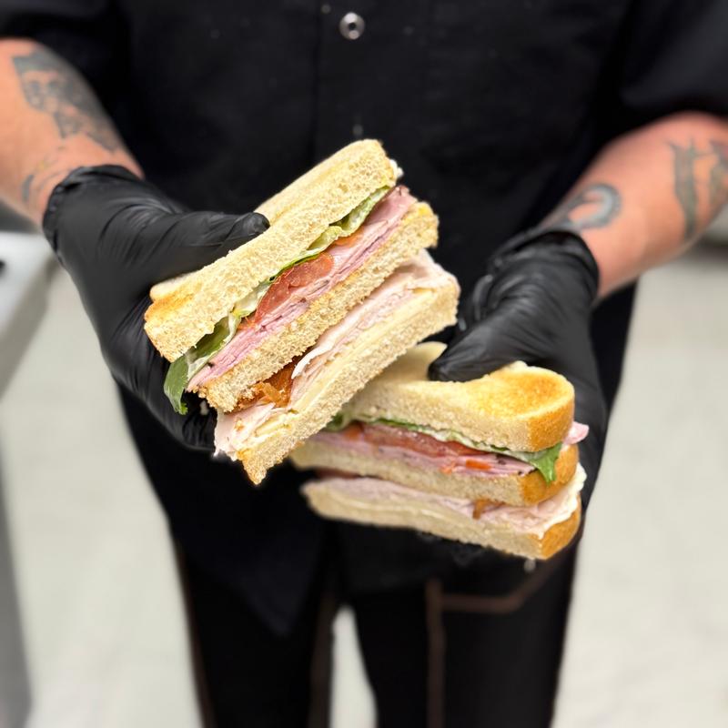 Ham, turkey, and bacon stacked high with hot pepper jack cheese, lettuce, tomato, and mayonnaise.